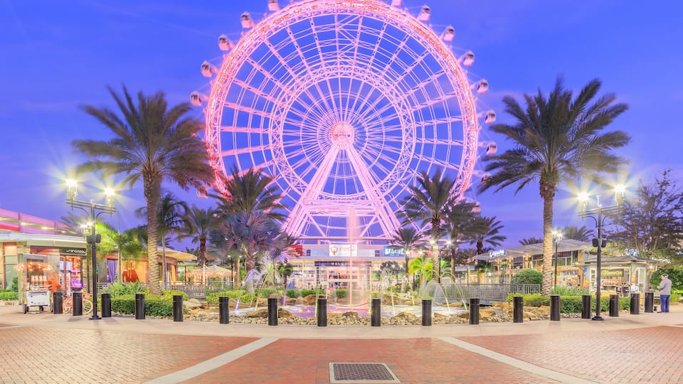 International Drive buzzes with amusement park energy and tourist-friendly attractions at every turn. The 400-foot ICON Orlando observation wheel dominates the skyline alongside quirky spots like WonderWorks' upside-down mansion. You'll find everything from Madame Tussauds to SEA LIFE Aquarium packed into this entertainment corridor, plus endless themed restaurants creating a carnival atmosphere. The I-Ride Trolley makes getting around a breeze for just $2 per ride, connecting you to major attractions every 20 minutes. Chain restaurants and Brazilian steakhouses dominate the dining scene, while mid-range hotels with pools and theme park shuttles offer comfortable places to crash after long days of fun.