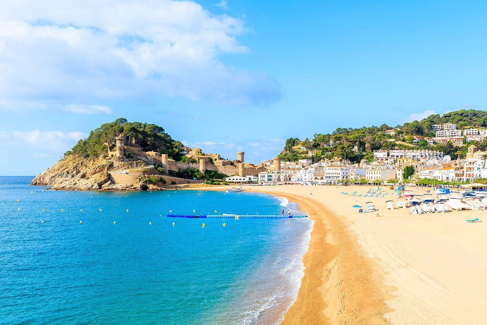 During summer, the beach is well-equipped with sun loungers, showers and toilets, and a beachfront cafe. Be sure to allow time to explore Tossa de Mar, with its turreted medieval castle and traditional seafood restaurants.