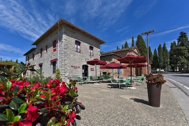 Descubre la elegancia arquitectónica de la Toscana en este hotel decorado con muebles selectos. Un verde jardín y un pintoresco viñedo crean un entorno pintoresco.