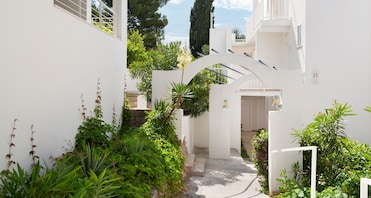 La elegancia arquitectónica se encuentra con la playa en este hotel de estilo mediterráneo. Los visitantes pueden relajarse en el jardín mientras disfrutan de las cercanas vistas de la costa.