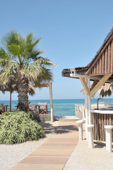 En este hotel frente al mar te esperan playas de arena. Toallas de playa, sombrillas y tumbonas completan la experiencia, además de un cómodo chiringuito.
