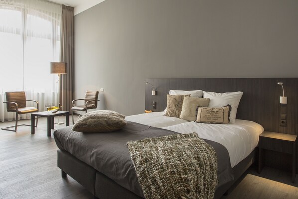 Kamer was fijn ruim en modern, maar heeft net als de meeste kamers alleen indirect daglicht en is schaars verlicht. We hadden maar 1 waterglas en 1 theeglas op de kamer. Eerste ochtend waren de bedden wel dichtgeslagen, maar geen schone handdoeken, andere ochtenden anders om. Ontbijt erg prijzig voor wat je krijgt. Ontbijtzaal wordt ook niet bijgehouden. Moesten zelf bij andere tafel shoppen voor bord, bestek en boter. Sapkan bijna leeg, alleen Kellogs ontbijtvlokken met melk, maar er waren geen lepels. Geen yoghurt en gezonde ontbijtgranen bijvoorbeeld. Goede koffie, maar geen lepeltjes om mee te roeren. Schaal met vers fruit, maar helaas onder de fruitvliegjes.