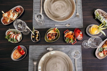 La cocina mediterránea deleita las papilas gustativas. Un bar, una cafetería y un comedor al aire libre añaden opciones. El desayuno buffet incluye comida vegetariana, vegana y ecológica.