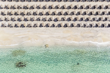 La playa de arena blanca llama a este hotel costero. Sombrillas, tumbonas y un restaurante frente a la playa crean la mejor experiencia junto al océano.